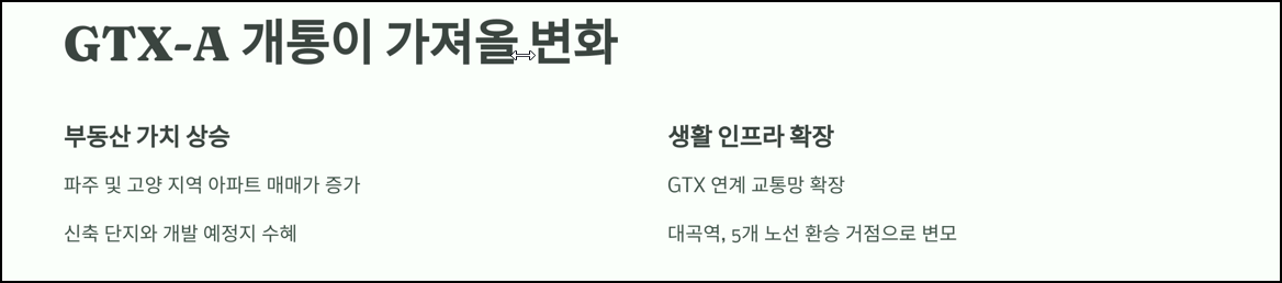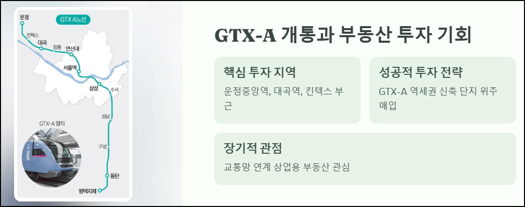 GTX-A 개통은 부동산 투자자들에게도 큰 기회로 다가오고 있습니다. 주요 지역과 투자 포인트를 살펴보겠습니다.