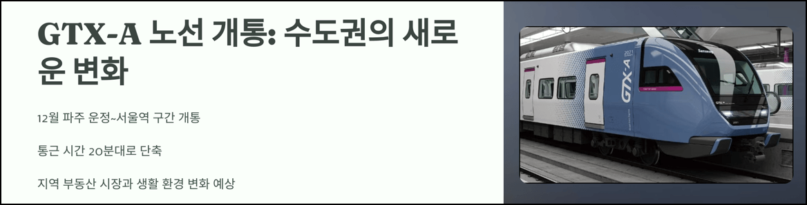 GTX-A 노선의 개통은 단순한 교통 개선을 넘어 수도권 전반에 걸친 대규모 변화의 신호탄입니다. 지역 간 격차를 줄이고, 새로운 투자와 생활의 기회를 제공할 이번 개통을 주목하세요. 특히, 역세권의 부동산 시장은 계속해서 뜨거운 관심을 받을 것입니다. 여러분의 생활과 투자에 긍정적인 영향을 줄 GTX-A 개통, 지금 준비해보세요!