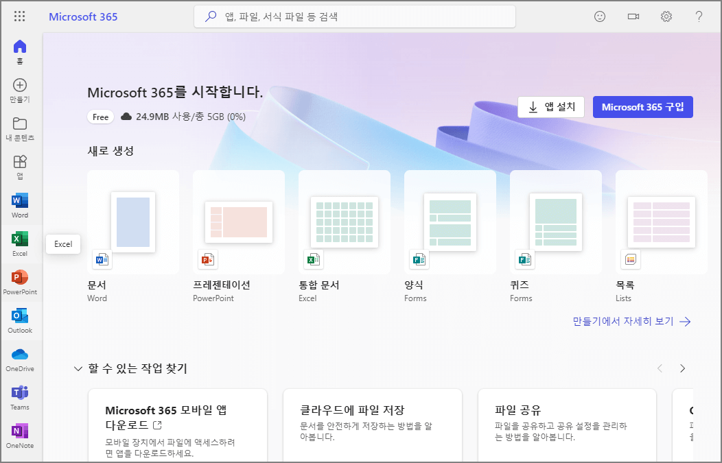 - 화면의 좌측의 워드, 엑셀, 파워포인트, 아웃룩, 팀즈, 원노트 앱을 이용할 수 있습니다.