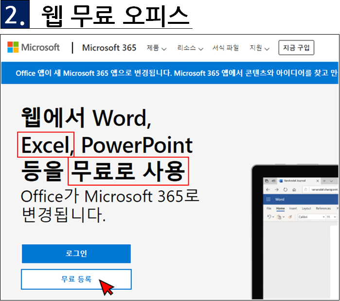 오피스 365 웹 버전을 무료로 이용할 수 있습니다. 먼저 선행되어야 할 조건은 Microsoft 계정에 가입 후 PC의 oneDrive와 연결하면 오피스 365를 사용할 수 있습니다.