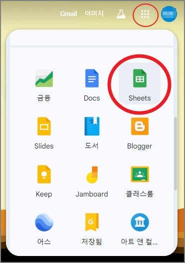 2. 오른쪽 상단의 점 9개를 클릭 후 스크롤을 내리면 'Sheets'를 클릭합니다